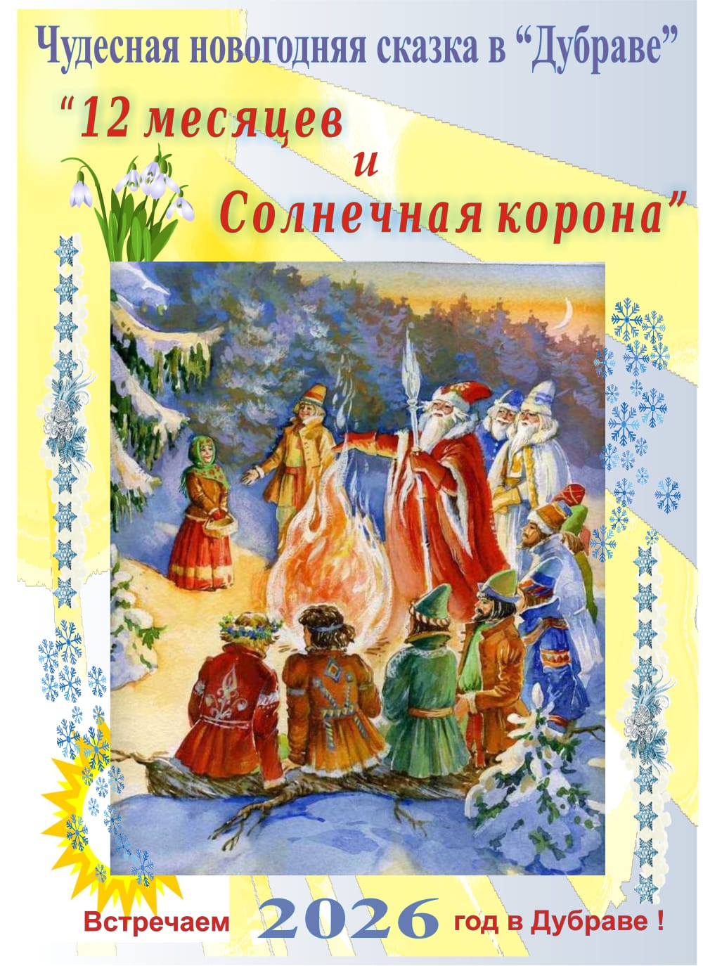 Дружной, веселой компанией, побываем в сказке, где нас встретят любимые волшебные герои, поздравят Дед Мороз со Снегурочкой! Мы будем петь, танцевать и веселиться! Водить хороводы у костра и любоваться "Горящим Сердцем Дубравы! "